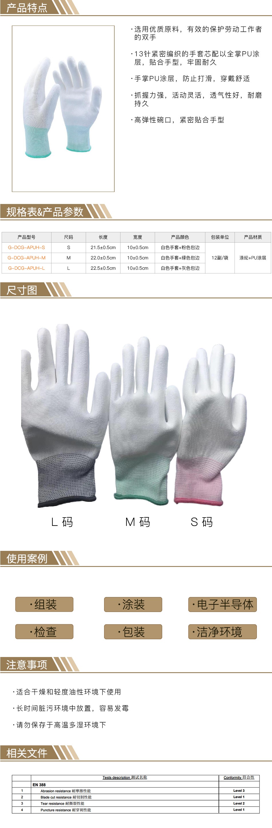 ●产品特征:13针紧密编织的手套芯配以指尖PU涂层,贴合手型,牢固耐久