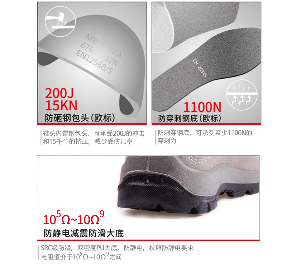 ●产品特征:·彩虹系列轻便透气安全鞋,毛面牛皮鞋面,双密度PU注塑鞋底·防砸、防刺穿、防静电、耐磨、耐油、SRC级防滑