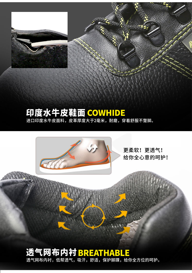 ●产品特征:·印度水牛皮鞋面·高品质双密度聚氨酯(PU) 注塑鞋底·EVA鞋垫·封闭鞋舌·轻便舒适、防砸、耐磨、耐油、 绝缘( 测试电压6000V,适用于1000V及以下电力设备上工作时,作为辅助安全用具)·SRC级防滑·符合国标、欧标·重量:1376g