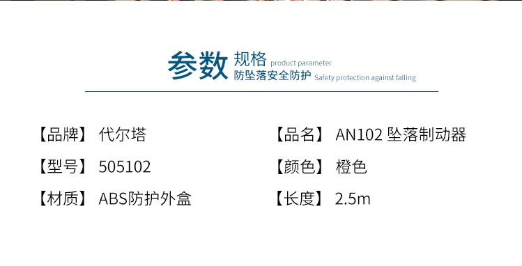 ●产品特征:·收缩式速差防坠器,配有万向轴,配有钢制O型钩AM002,高强度ABS防护外盒,缓冲带宽46毫米,大展开长度2.5米。·通过电力工业电力安全工器具质量监督检验测试中心检测。·颜色:橙色