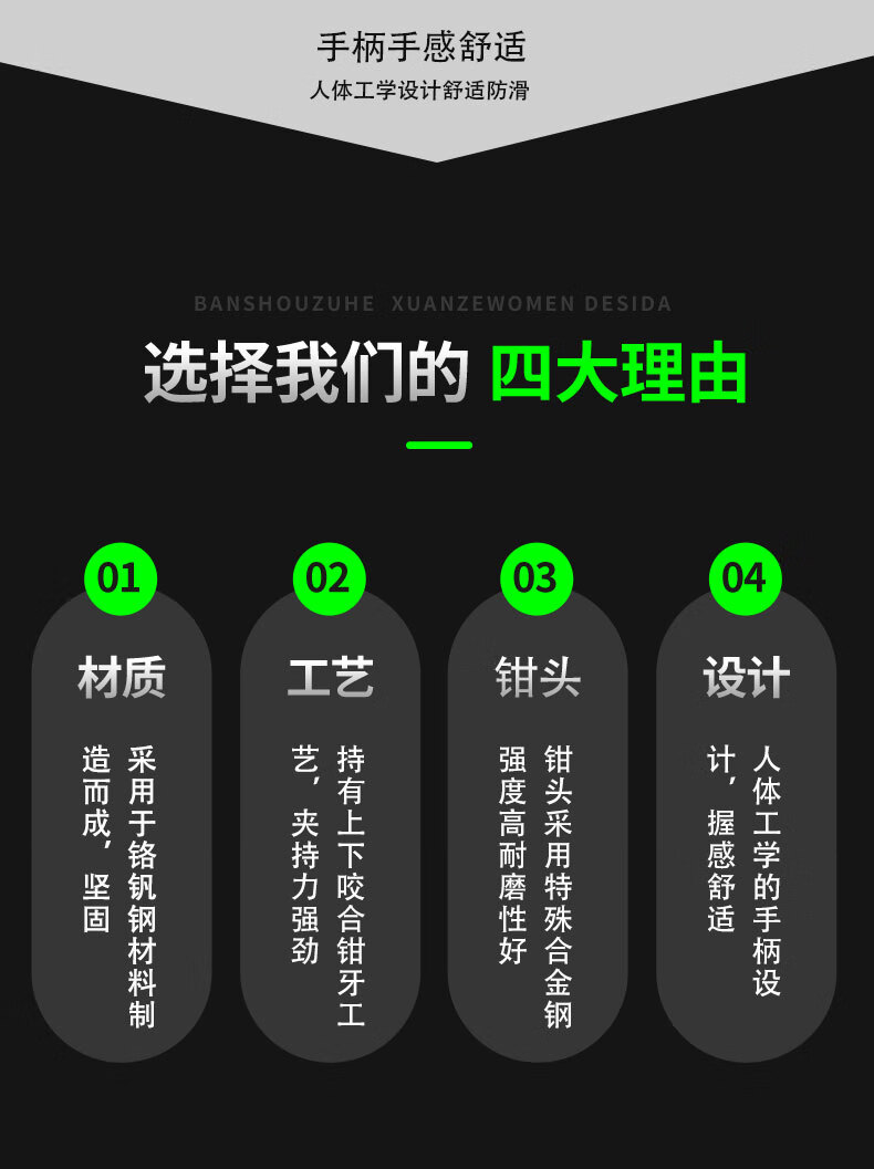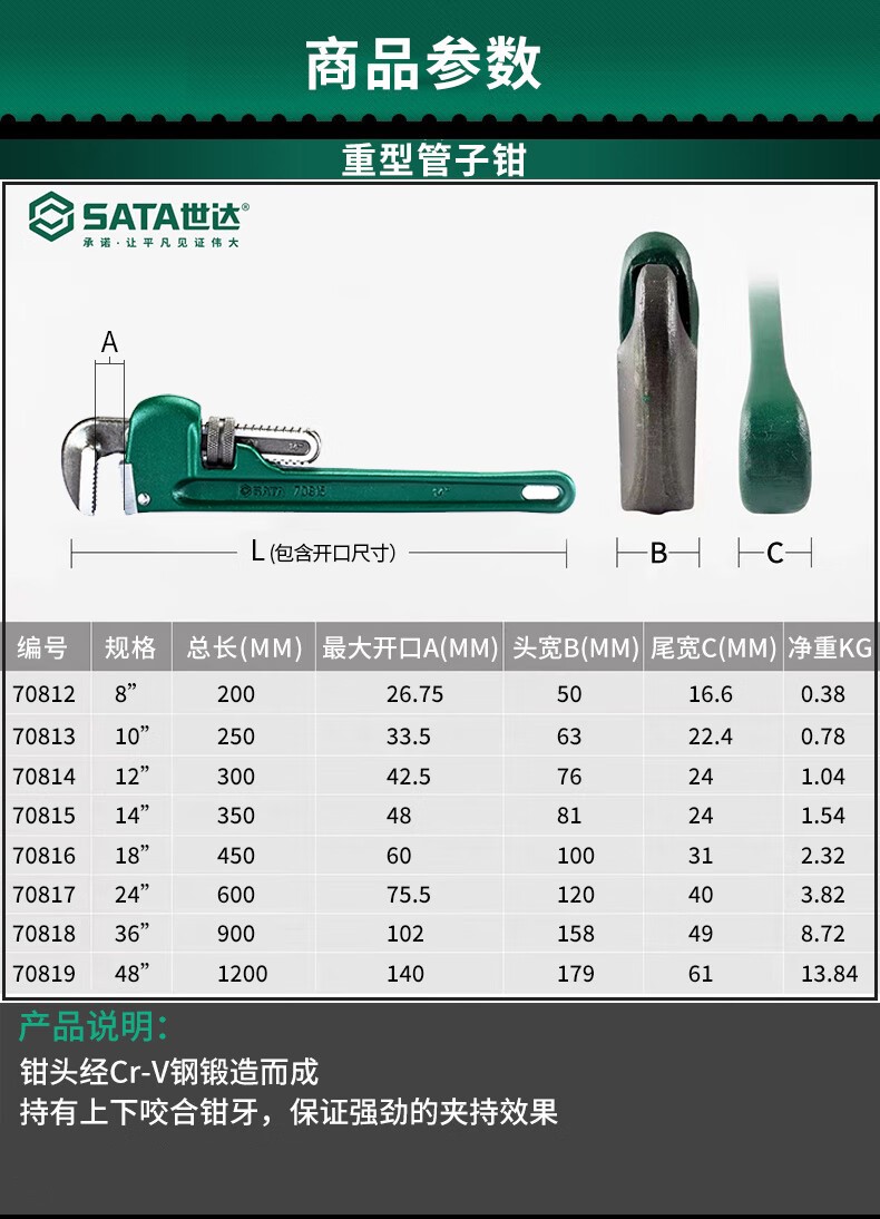 ●产品特征:·钳头经Cr-V 铬钒钢锻造而成·特有上下咬合钳牙设计,保证强劲的夹持效果