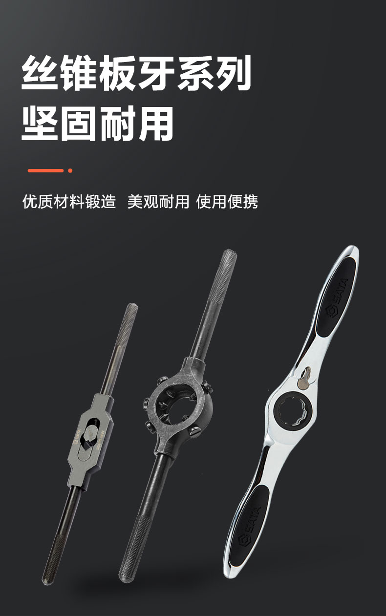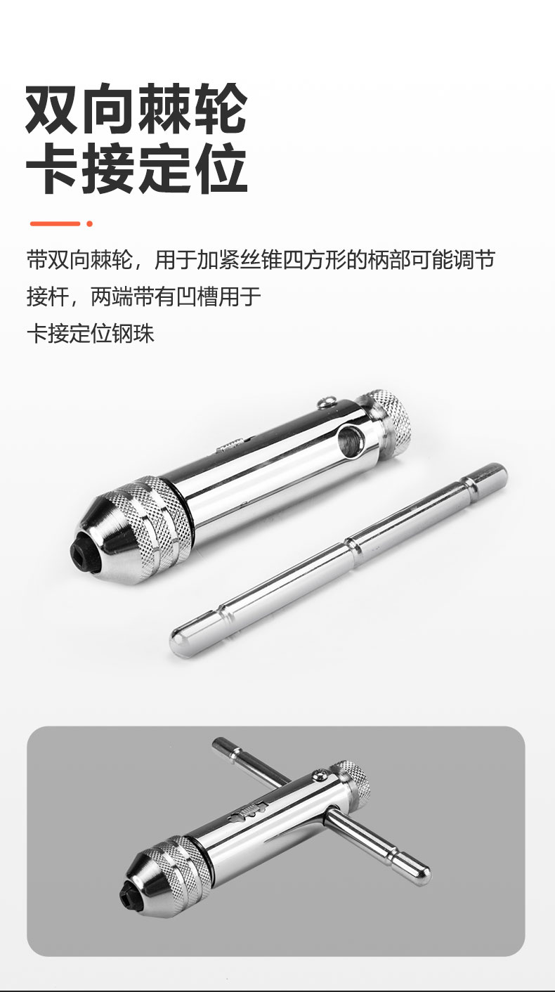 ●产品特征:·整体采用全钢加工,适用于高扭矩负载,卡爪韧性好,表面硬度佳·有快左旋,快右旋及固定3 个位置,较常规锌合金棘轮扳手,使用寿命延长5 倍·带双向棘轮,用于加紧丝锥四方形的柄部可以调节·接杆,两端带有凹槽,用于卡接定位钢珠·非常适合在狭小的工位进行攻丝·适用于手用丝锥GB/T3464-2007