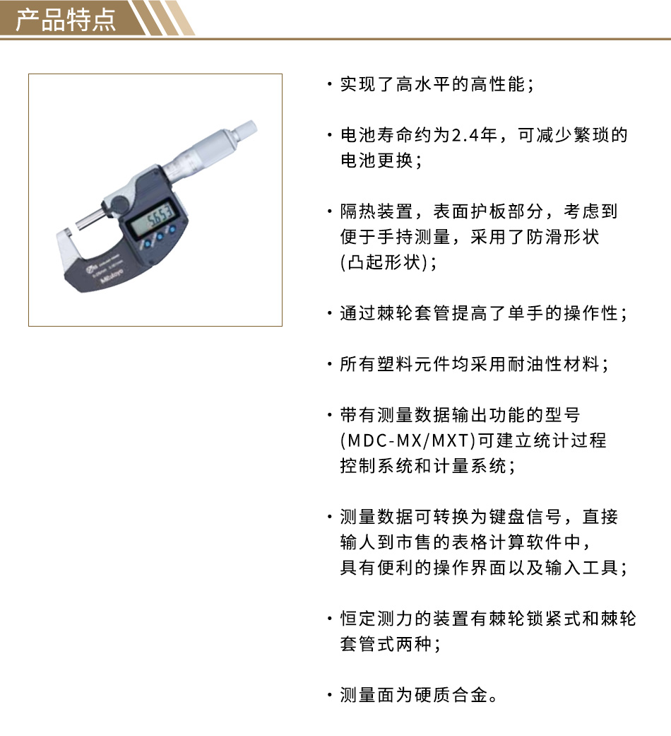●产品特征:·原点设置,调零,自动电源开/关,数据保持,公英制转换·棘轮锁定装置·带有防水连接电缆·所有塑料元件均由防油材料制成·IP65防护等级,能够用于各种环境,如暴露在切割油等环境下使用。注:使用后需要进行防腐处理