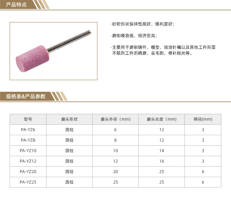 ●产品特征:·砂轮形状保持性能好,锋利度好,磨削噪音低,经济型高