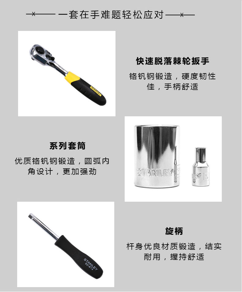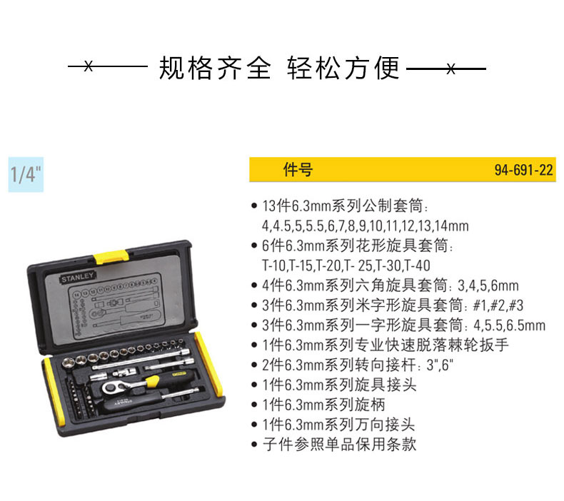 优质铬钒钢锻造,精细做工,规格齐全 内含工具规格: 13件6.3MM系列公制套筒:4、4.5、5、5.5、6、7、8、9、10、11、12、13、14mm 6件6.3MM系列花型旋具套筒:T-10,T-15,T-20,T-25,T-30,T-40 4件6.3MM系列6角旋具套筒:3,4,5,6mm 3件6.3MM系列米字型旋具套筒:#1,#2,#3 3件6.3MM系列一字型旋具套筒:4,5.5,6.5mm 1件6.3MM系列专业快速脱落棘轮扳手 2件6.3MM系列转向接杆:3",6" (75mm,150mm) 1件6.3MM系列旋具接头 1件6.3MM系列旋柄 1件6.3MM系列万向接头