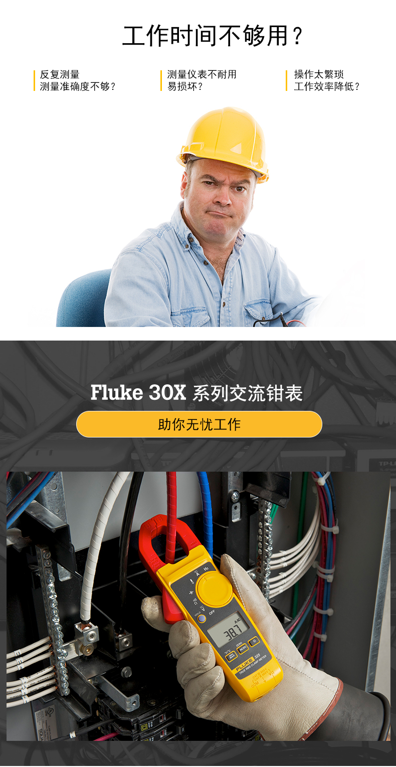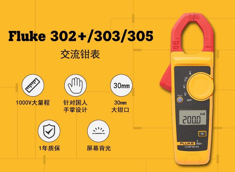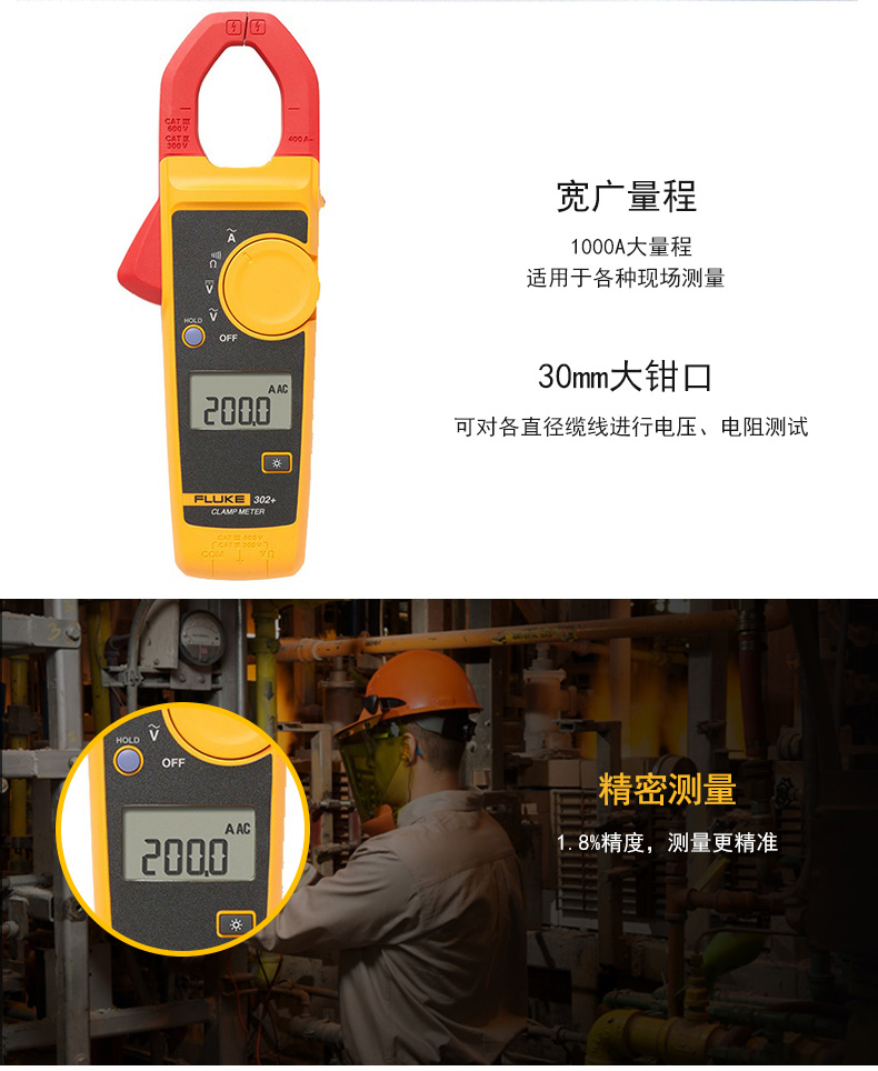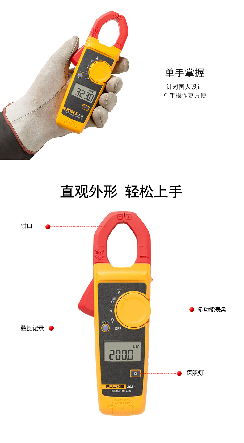 ●产品特征:FLUKE 302+钳形表钳形电流表使用简便,紧凑外观,便于携带,可以满足日常基础电气维护的需要 ·400A交流电流测量 ·30mm的大钳口 ·有背光功能