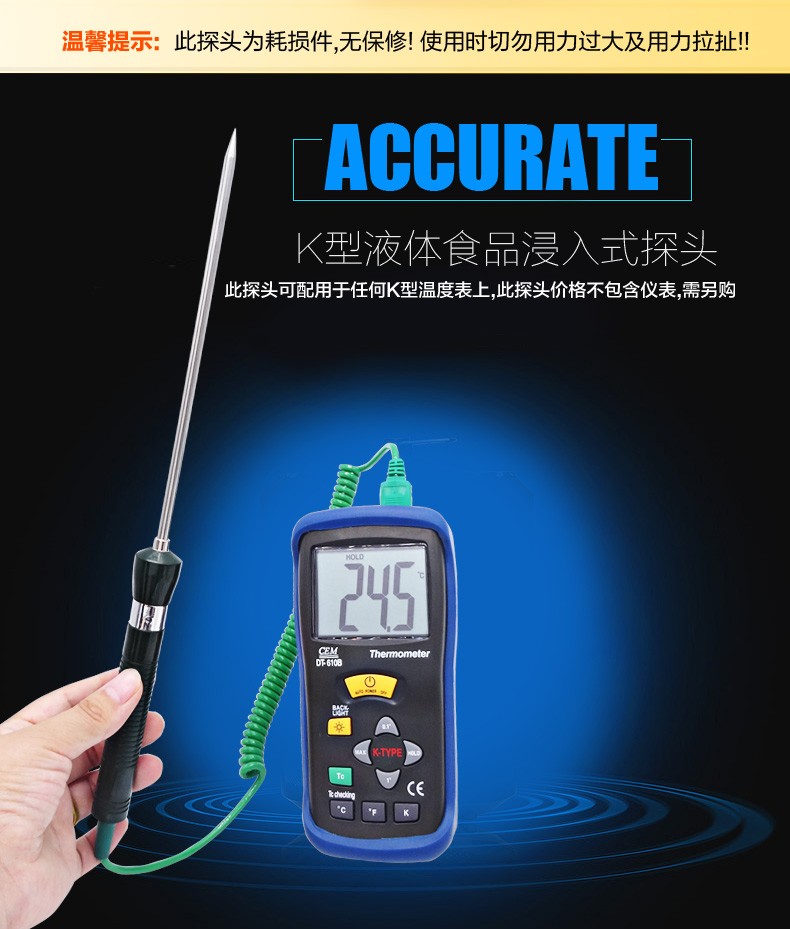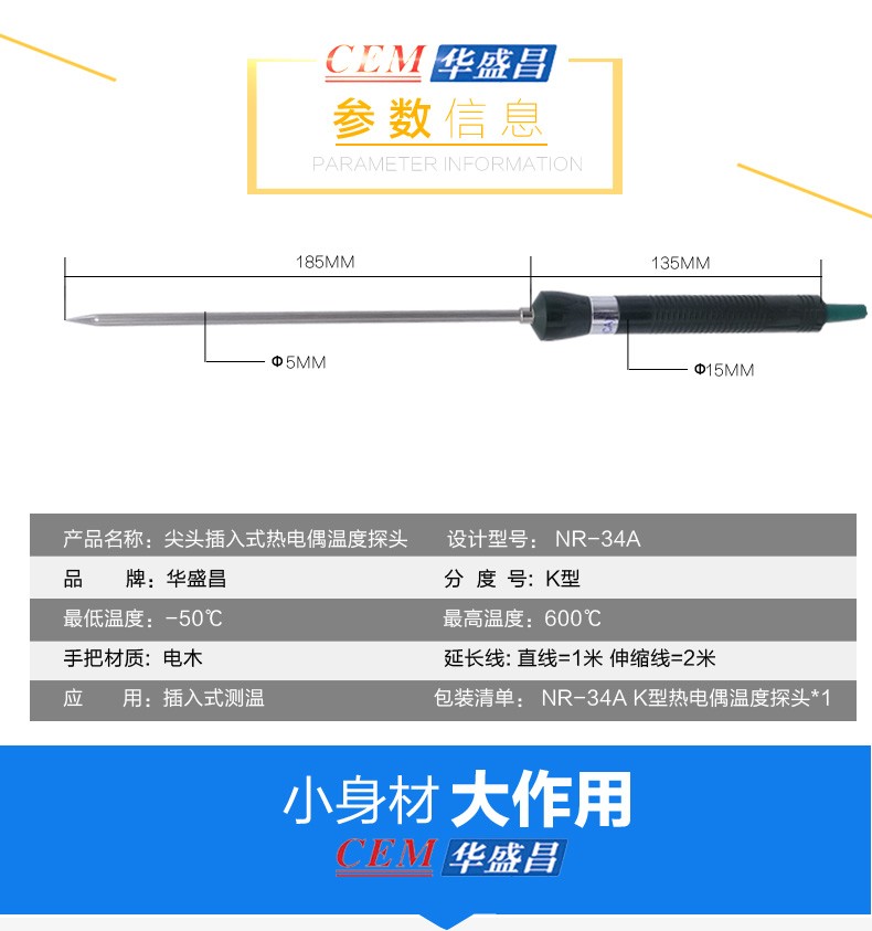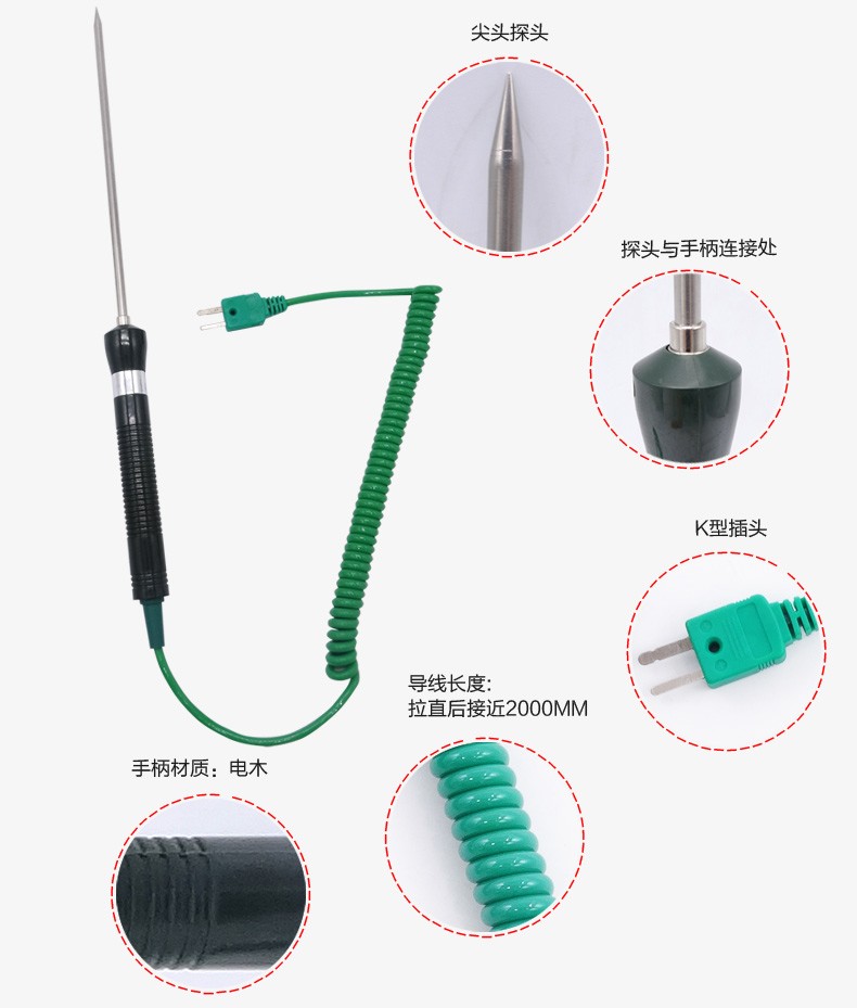 ●产品特征:K型专业温度探头,测温量程-50℃~400℃,杆长为33CM,伸缩线为1M,应用于测表面温度、高温
