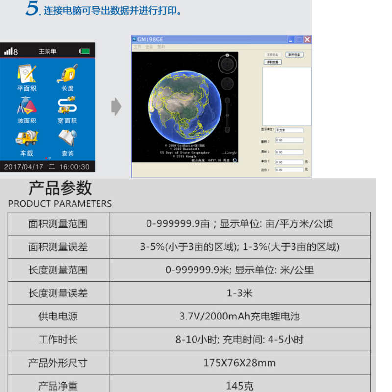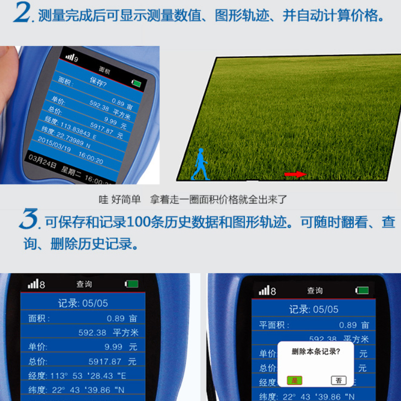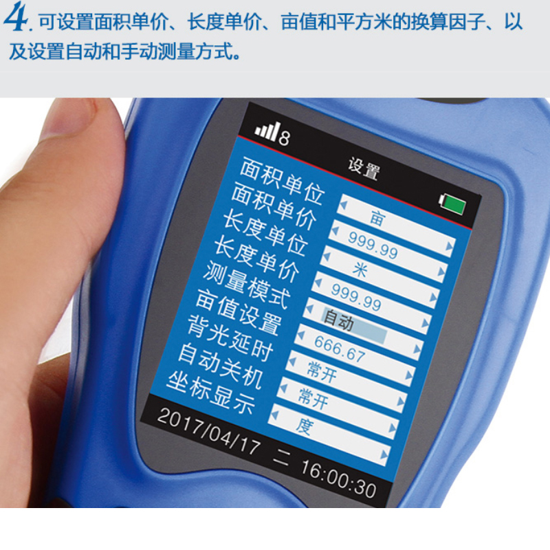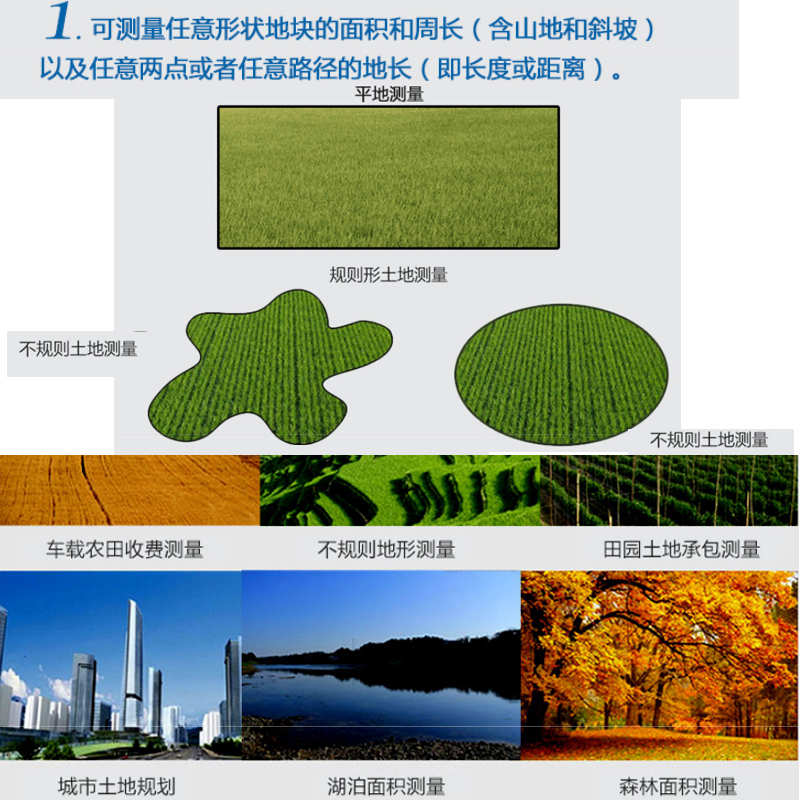 1.面积测量范围: 0.3-999999.99亩; 显示单位: 亩/平方米/公顷/平方公2.面积测量误差: 1-3%(小于3亩的区域);≤1%(大于3亩的区域)