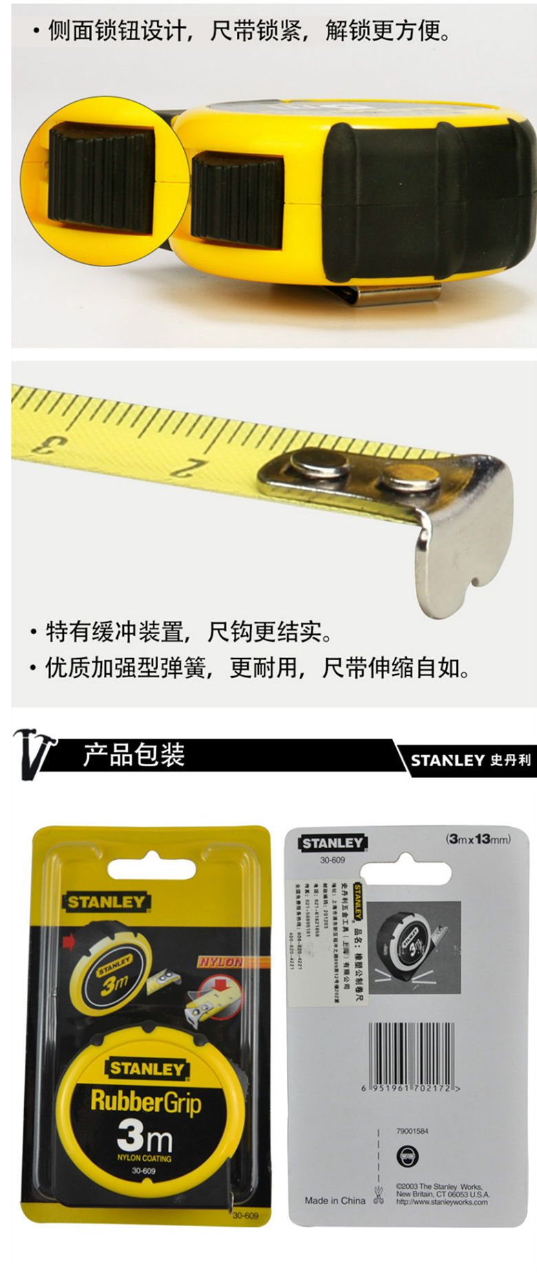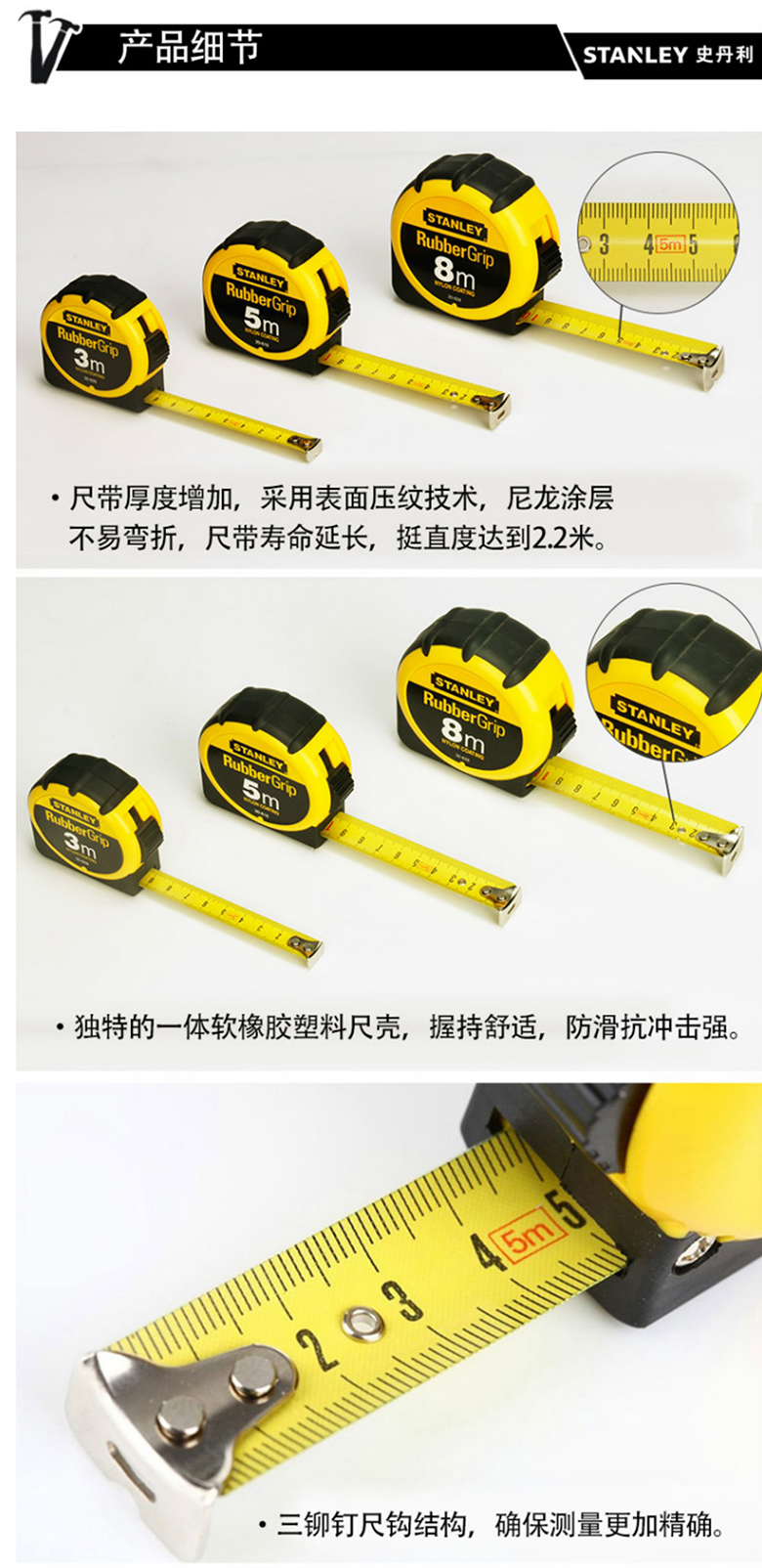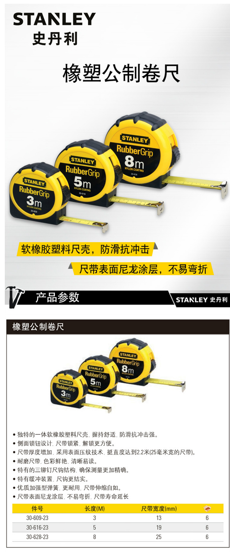 ●产品特征:·尺带表面尼龙涂层,不易弯折·独特的一体软橡胶塑料尺壳,握持舒适,防滑抗冲击强·侧面锁钮设计,尺带锁紧,解锁更方便·尺带厚度增加13%,采用表面压纹技术,挺直度达到2.2米(25mm宽尺带)·耐磨尺带,色彩鲜艳,清晰易读·特有的三铆钉尺钩结构·优质加强型弹簧,更耐用,尺带伸缩自如