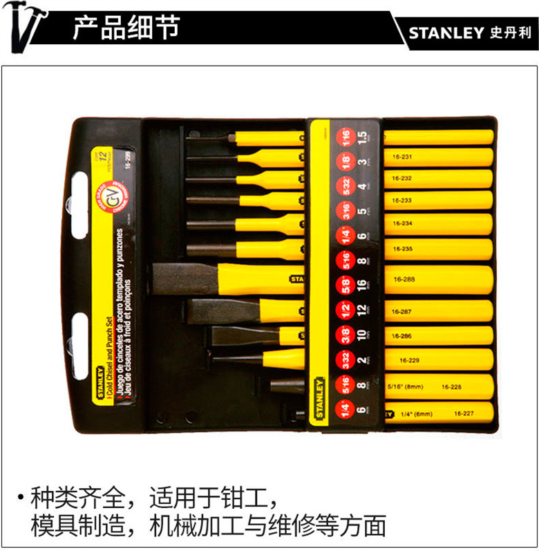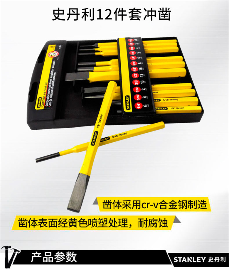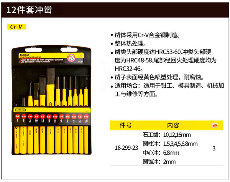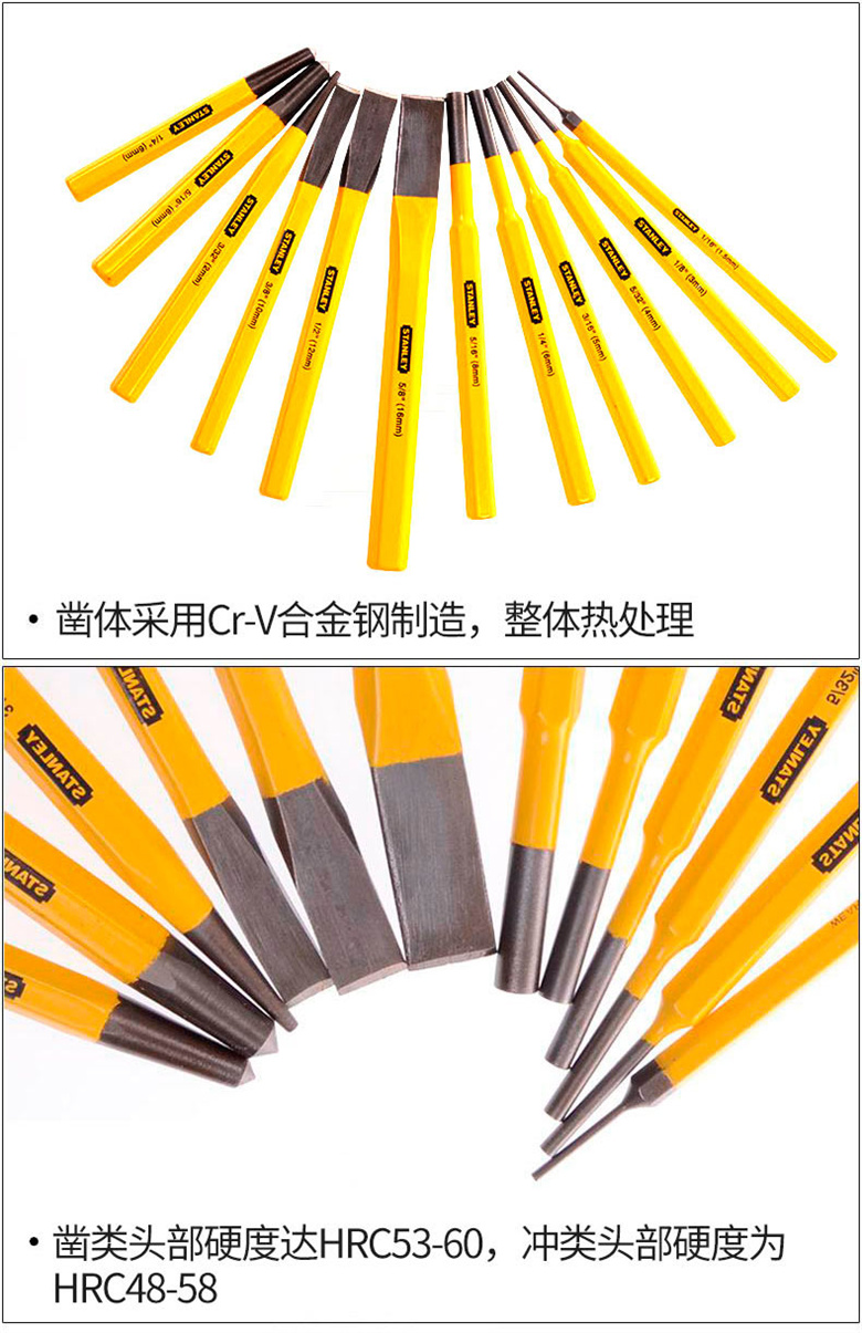 ●产品特征:·CR-V材质·整体热处理·凿类头部硬度达HRC53-60,冲类头部硬度为HRC48-58·凿子表面经黄色喷塑处理,耐腐蚀·内含工具规格:石工凿:10,12,16mm圆柱冲:1.5,3,4,5,6,8mm中心冲:6,8mm圆锥冲:2mm