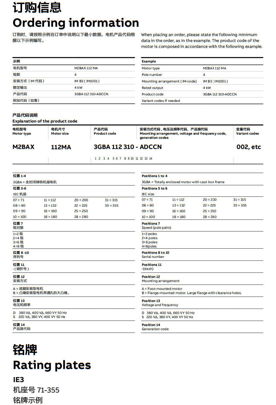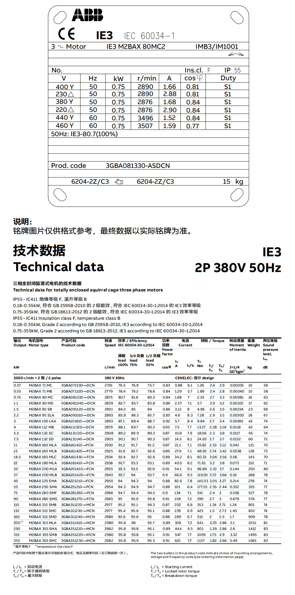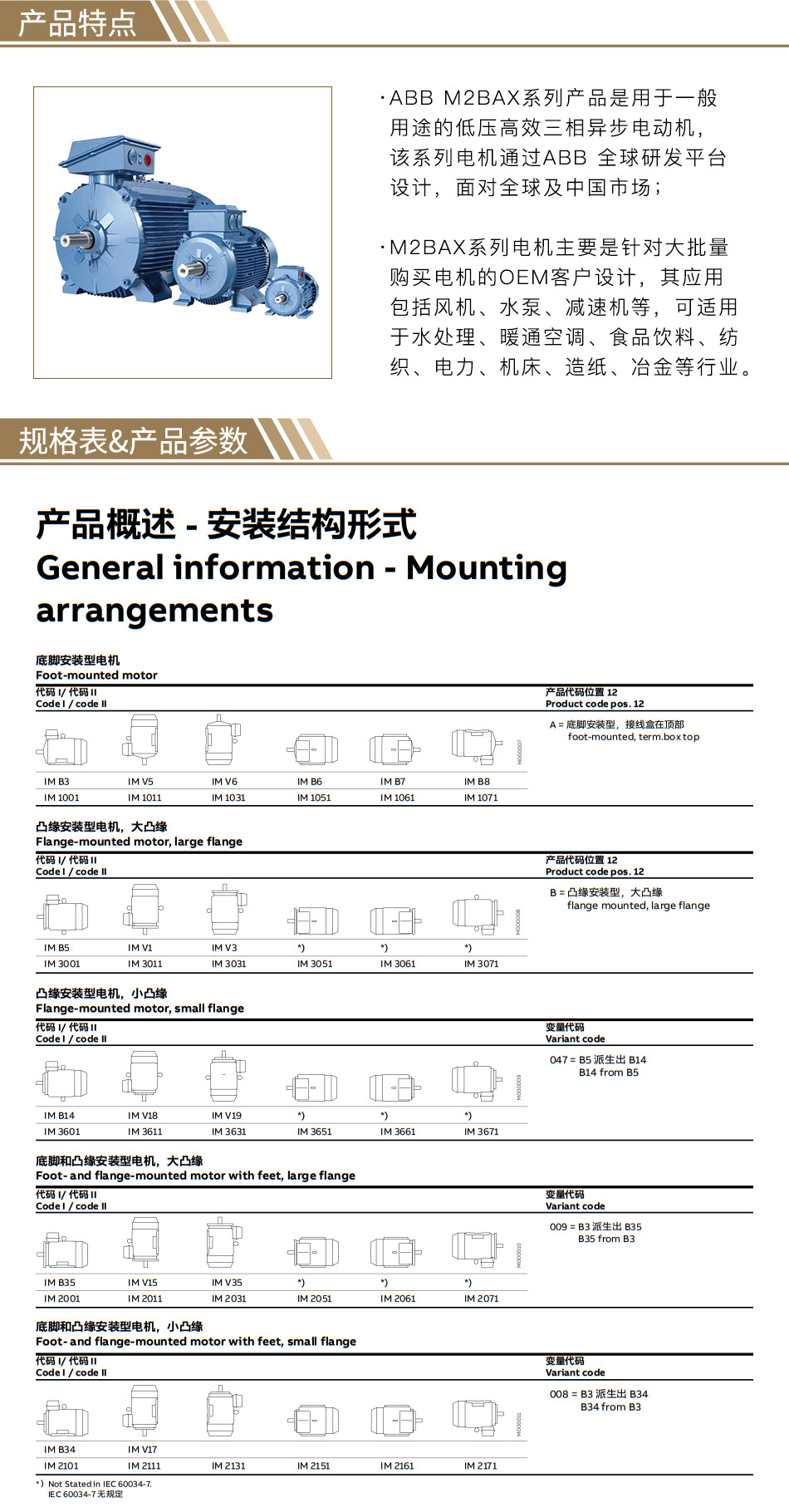 ●产品特征:·ABBM2BAX系列产品是用于一般用途的低压高效三相异步电动机,该系列电机通过ABB全球研发平台设计,面对全球及中国市场; ·M2BAX系列电机主要是针对大批量购买电机的OEM客户设计,其应用包括风机、水泵、减速机等,可适用于水处理、暖通空调、食品饮料、纺织、电力、机床、造纸、冶金等行业。