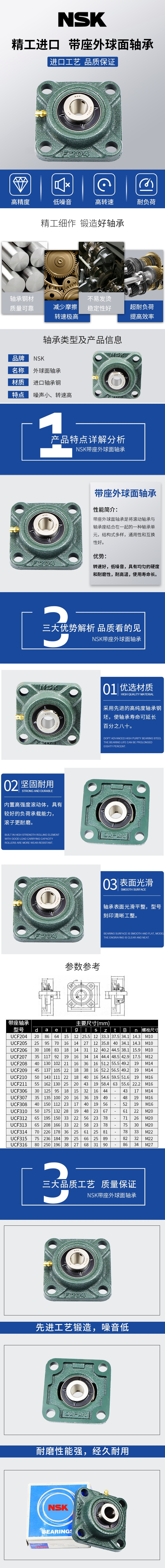 ●产品特征:·带座外球面轴承由向心球轴承,密封圈及轴承座组成·带止动螺钉·点维护型预先封入定量的优质润滑油,用户在使用前不需加润滑脂,这样可以减轻用户的维护工作量及降低维护成本·由于不需要加润滑脂,不需要加润滑脂用的油管等设备,可以使设备更紧凑·密封可以防止润滑脂外漏而污染环境