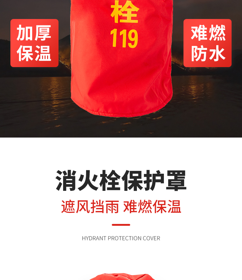 ●产品特征:轰烈 室外消火栓保温罩 外层优质阻燃防水布料,内层纯棉保温材料,有效降低室外消火栓在低温天气下因结冰造成损坏的情况的发生。