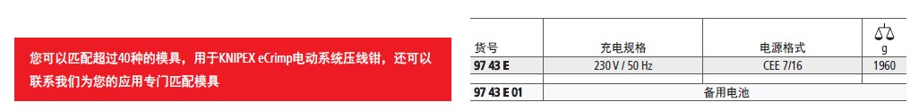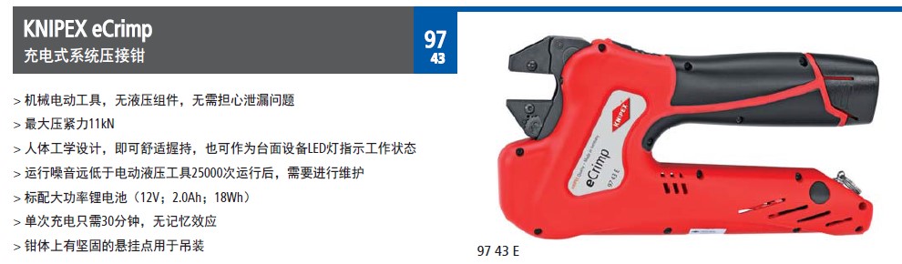 ●产品特征:·电动机械驱动的压线钳,有70多种不同规格的压模可供选配(压模另配),可压接各种类型的端子·操作低噪音,钳口压接区域配有LED照明,操作过程可随时中断,操作更安全可靠·按钮部位有电池电量显示,可立式、卧式移动操作·使用简便安全可靠