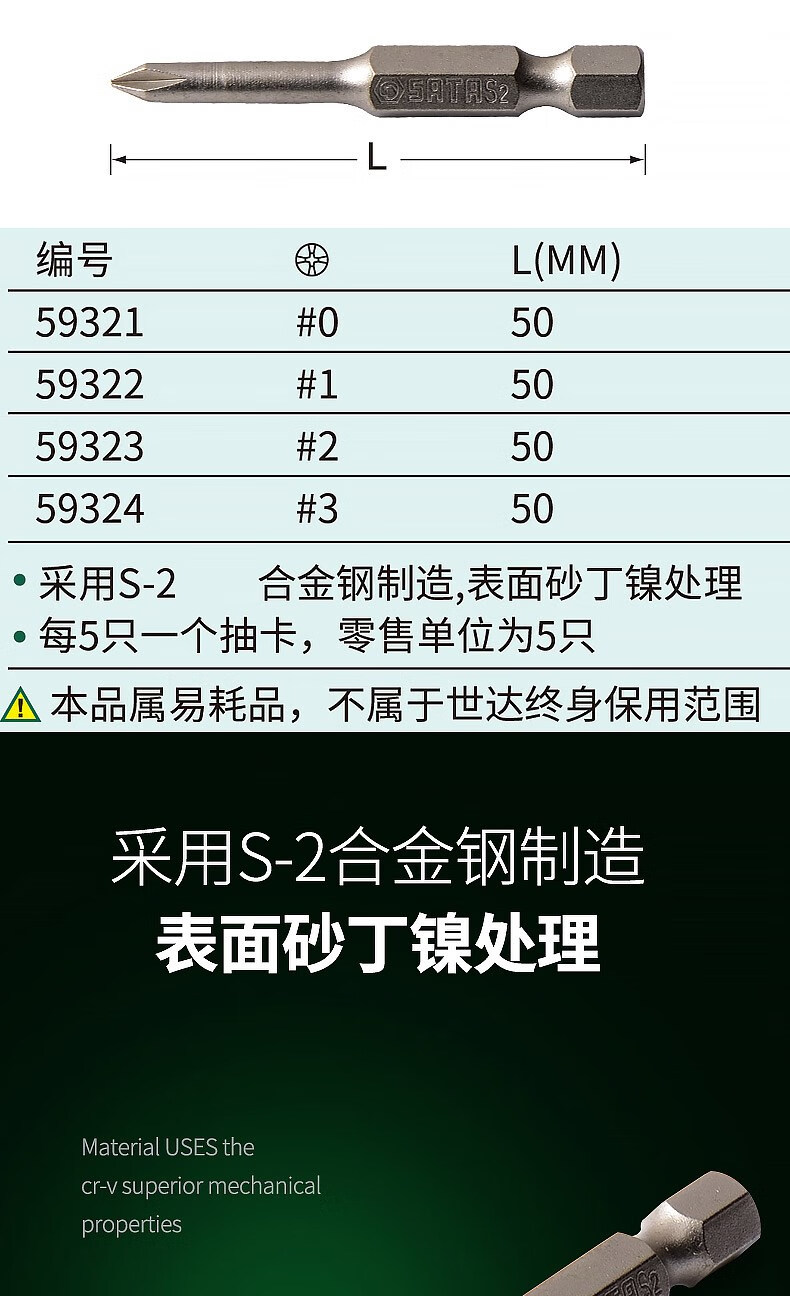 ●产品特征:·采用S-2高级合金钢制造,表面砂丁镍处理,硬度高,寿命长·销售包装数量:5支/卡