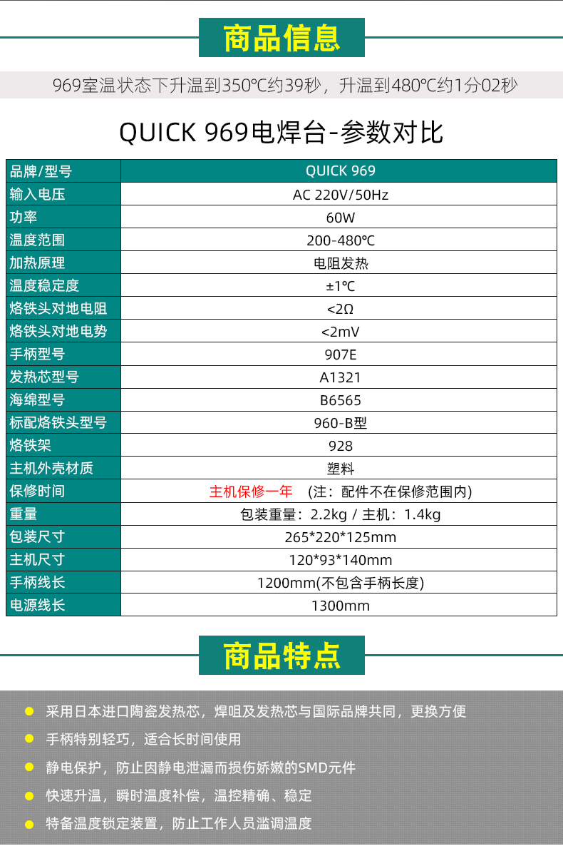 ●产品特征:·采用日本进口陶瓷发热芯,手柄轻巧,适合长时间使用·防静电设计,防止因静电泄漏而损伤的SMD元件·升温迅速,温度补偿快,温控稳定·特备温度锁定装置,防止工作人员滥调温度