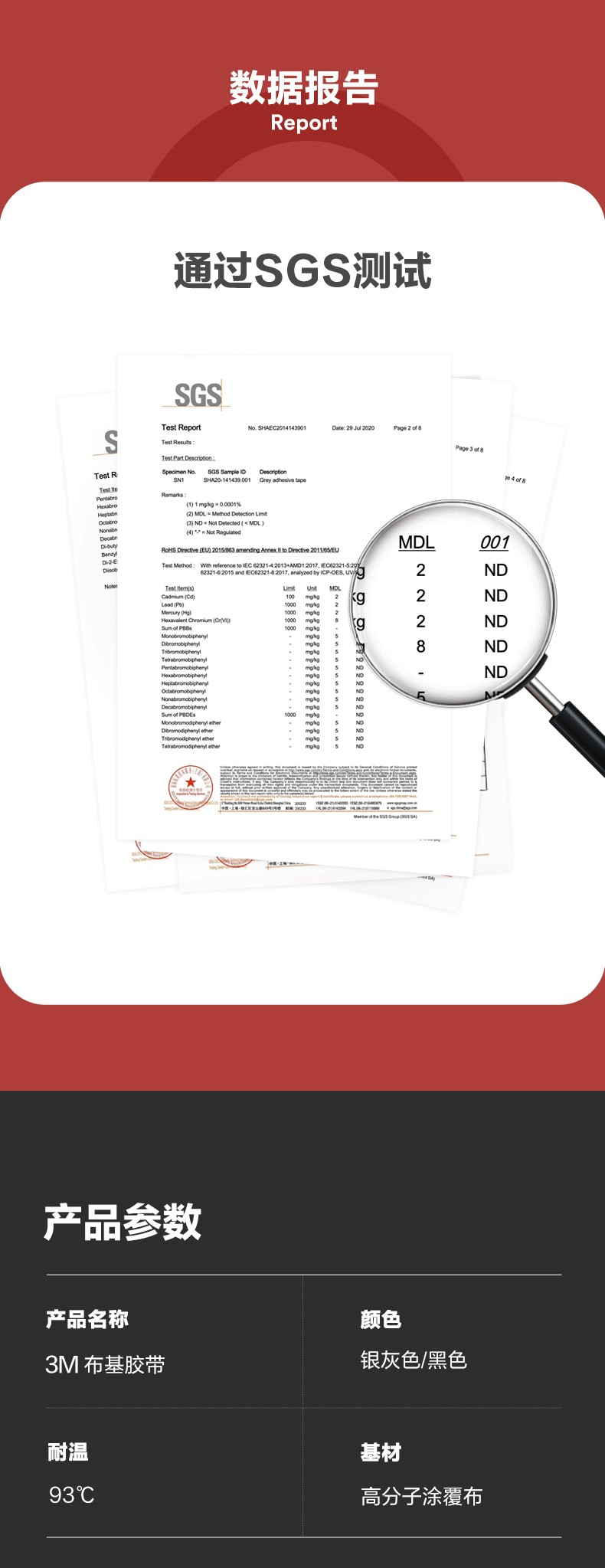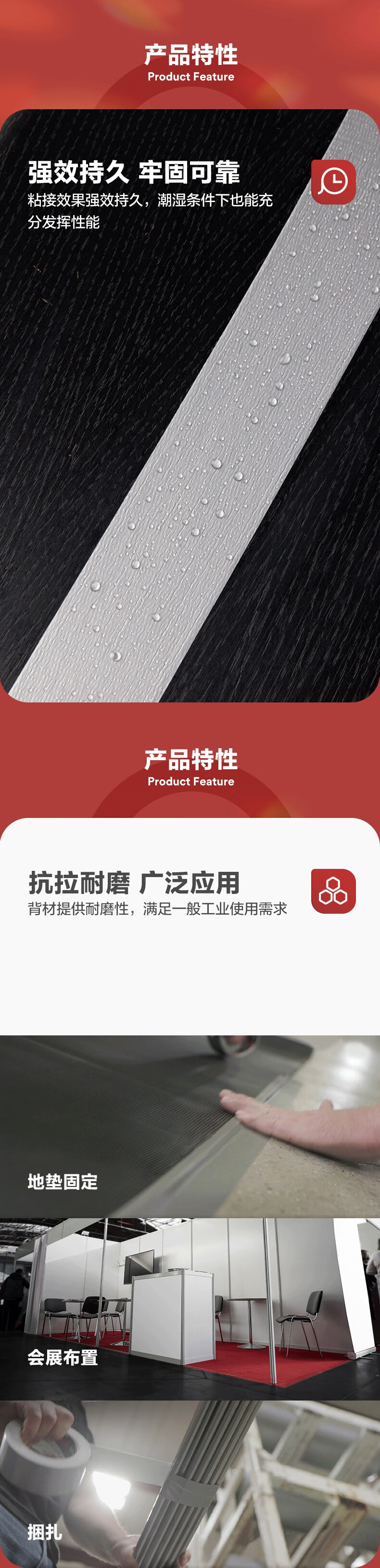 ●产品特征:·以高分子涂覆布为背材,橡胶胶黏剂·耐潮、防水和耐磨·能够粘附在大部分表面·用手即可撕断·抗张强度高·服帖性好