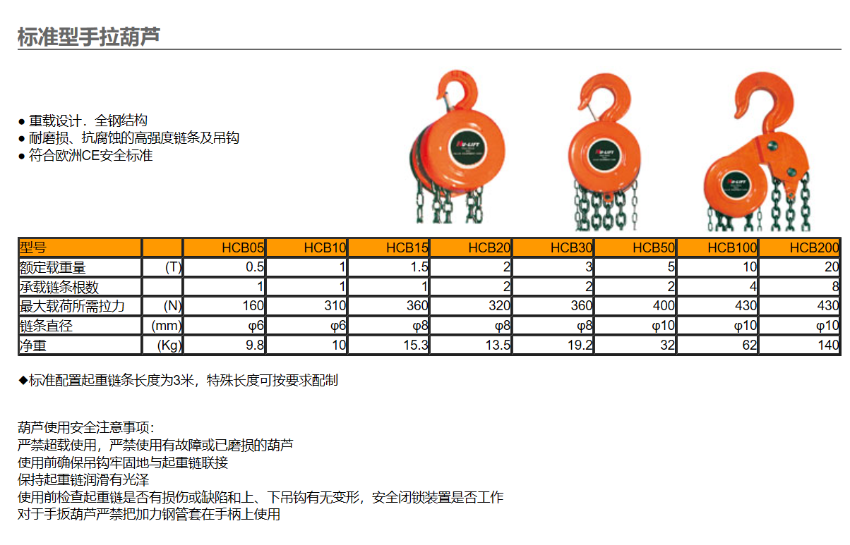 ●产品特征:·耐磨损、抗腐蚀的链条及吊钩·重载设计,全钢结构·符合欧洲CE安全标准