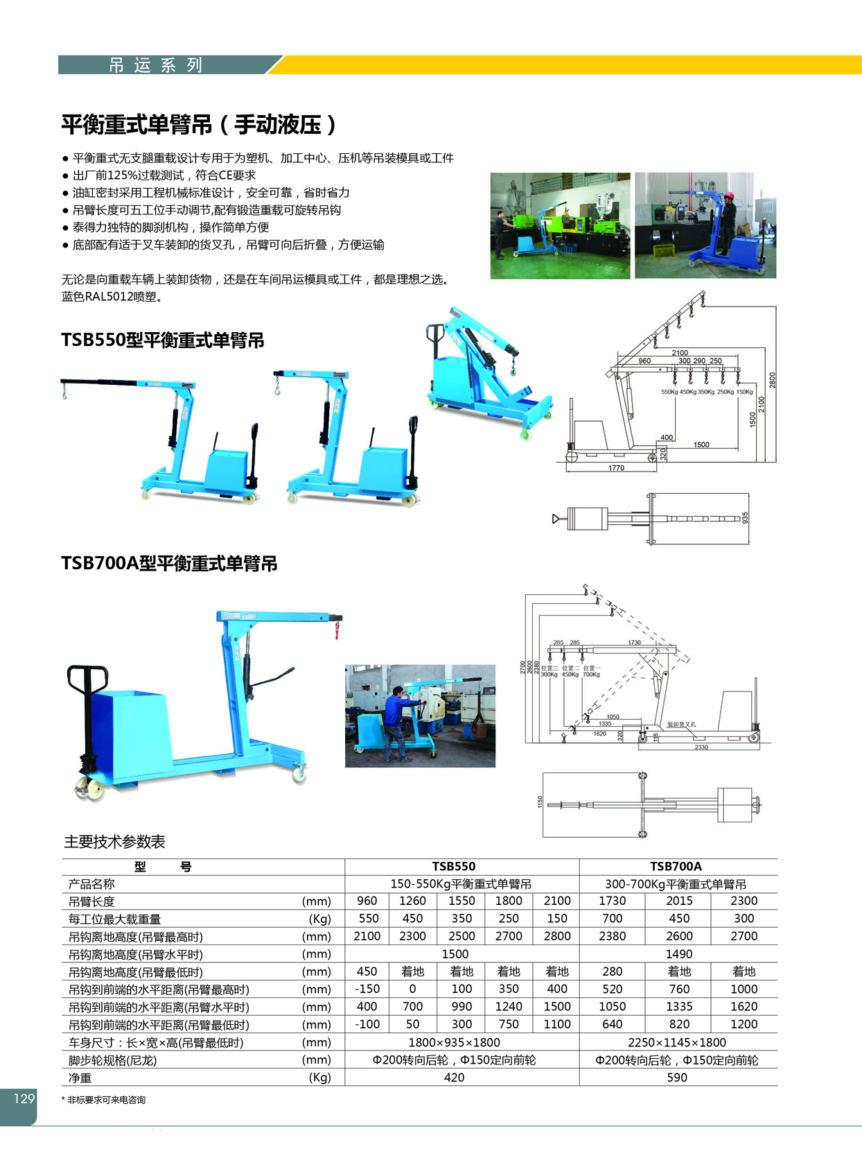 ●产品特征:·平衡重式无支腿重载设计用于为塑机、加工中心、压机等吊装模具或工件 ·独特的脚刹机构,操作简单方便 ·底部配有适于叉车装卸的货叉孔 ·与经济型单臂吊机相比大的优点是无伸出支腿,增大工作范围