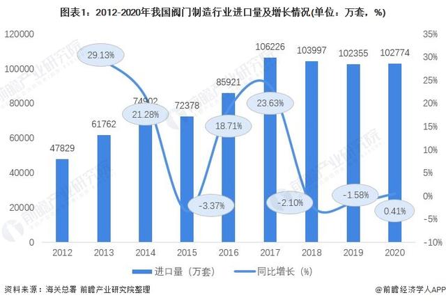 海关数据显示,2012-2020年,我国阀门制造行业进口量总体呈波动上升趋势。2018-2019年这两年由于受到与美国的贸易摩擦影响,行业进口量和增速均下滑。2020年行业进口量为102774万套,同比上升0.41%。