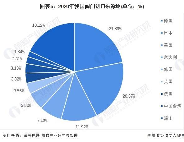 2020年我国阀门进口主要来源地位德国、日本和美国。我国共计从德美日三国进口阀门48.19亿元,占阀门总进口金额的54.38%。2020年,我国阀门进口主要来源地的前十位分别为德国、日本、美国、意大利、韩国、英国、法国、中国台湾、瑞士和印度,共计进口金额72.56亿元,占总进口金额的81.88%。